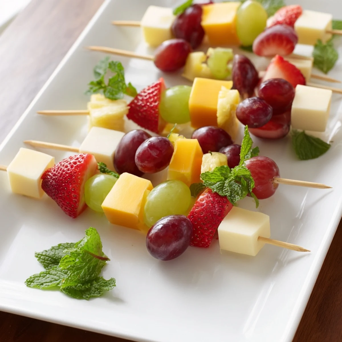 Perfect for entertaining, these kabobs feature green and red grapes, strawberries, pineapple chunks alongside cheddar and Monterey Jack cubes. The balance of creamy and crisp textures makes them universally appealing.