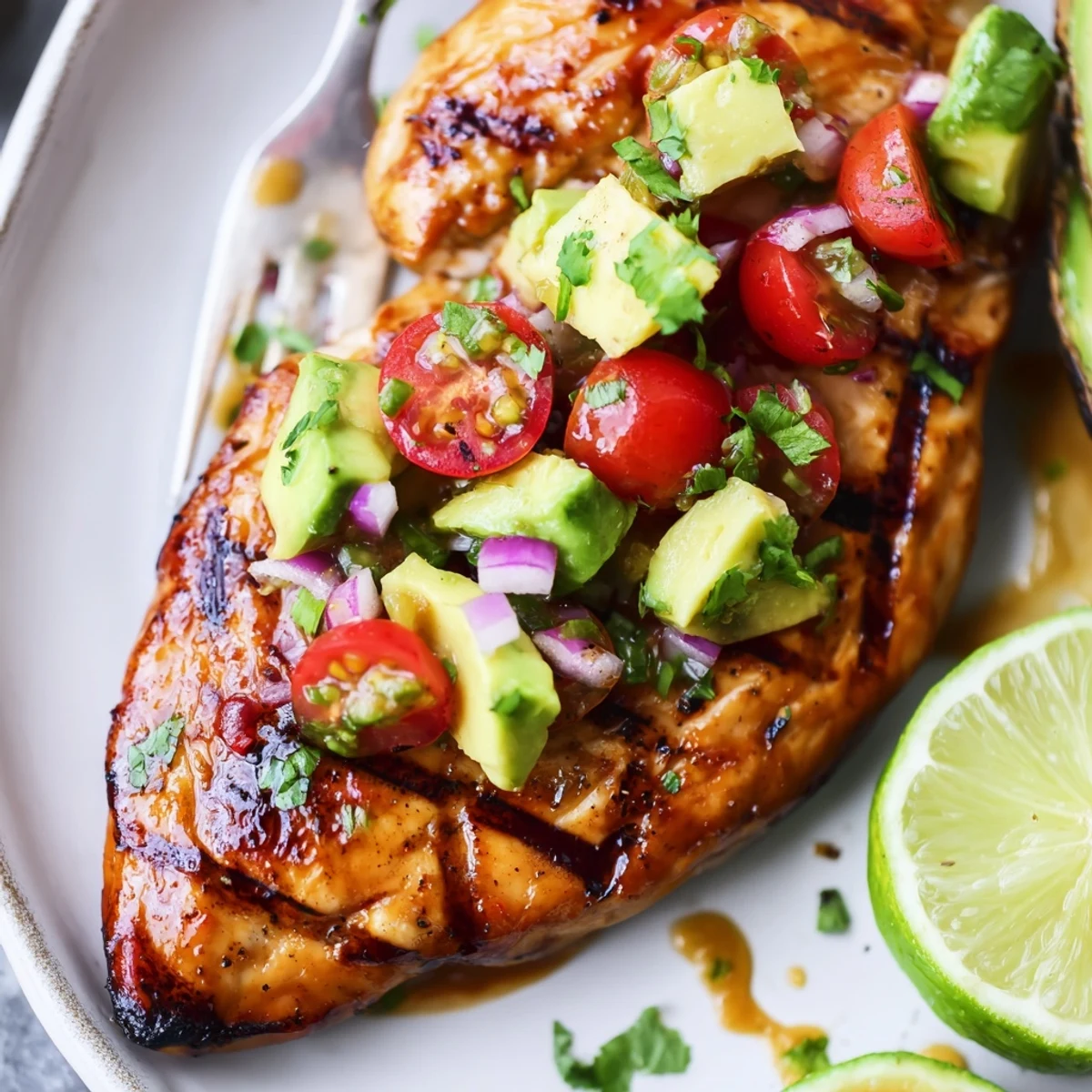 This zesty, lime-and-spice chicken is marinated briefly, grilled until lightly charred, and finished with a fresh avocado, cherry tomato, red onion and cilantro salsa. Marinate 15 minutes to 2 hours, grill 6–8 minutes per side, add cheese in the final minutes if desired, and serve with rice, tortillas or a salad for a vibrant meal.